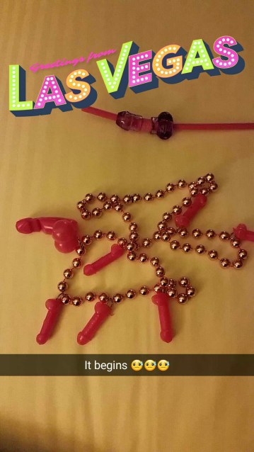 Anyhow, we arrived in Vegas at close to 11PM and my crew headed to Omnia at around midnight. At this point, I would like to remind you that I woke up at 4AM Eastern time. That translates to 1AM Pacific time. And now I am only leaving the hotel at 12AM Pacific time. And while I was not greeted with shots, being greeted with the NSFW bachelorette party goodies in the hotel room was a strange experience in and of itself… (Given that I am the vigilante who will herd children away from the bachelorette party section of Spencer’s. They get lured in by the Pikachu backpacks and start walking towards the lava lamps and they don’t need to see all the sex toys in between!)
