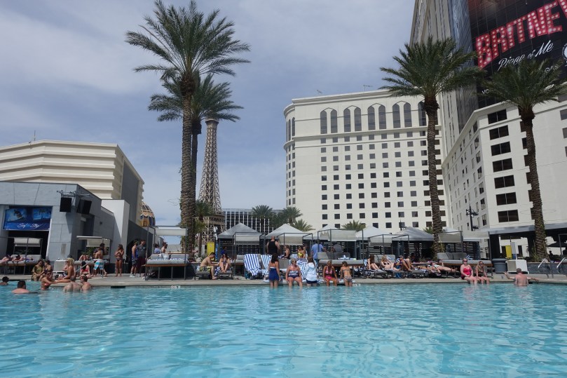 After some yums and a quick SPF stock-up, we got changed and headed to the pool at Planet Hollywood for some sweet poolside chilling. (While the original plan was to do some pool clubbing in the evening, at this time of year, even though the days were 80°F or more, the evenings are just too chilly for the pool.) This may have been one of the quietest pools I’ve ever visited, with no kids screaming and splashing around. The adults weren’t really splashing or screaming either. Mostly, folks were just sunbathing, and only a few people were even touching the water, by sitting on the edge of the pool and dangling their feet in the cool blue water. Even the EDM tracks playing in the background seemed fairly quiet. It was another moment of peace where I was able to take time to just soak up the blue sky, the warmth of the the sun, the palm trees next to the giant Britney Spears billboard.