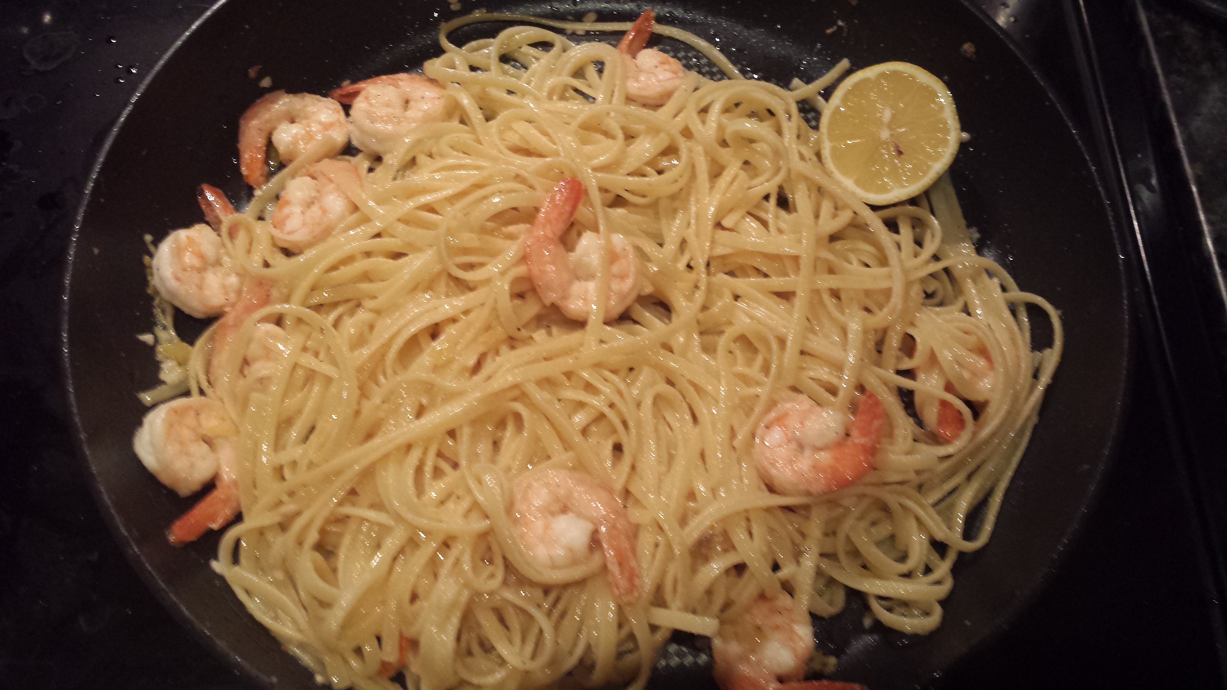 Drain your cooked linguine and put it back in the pot with your shrimp and other goodness.